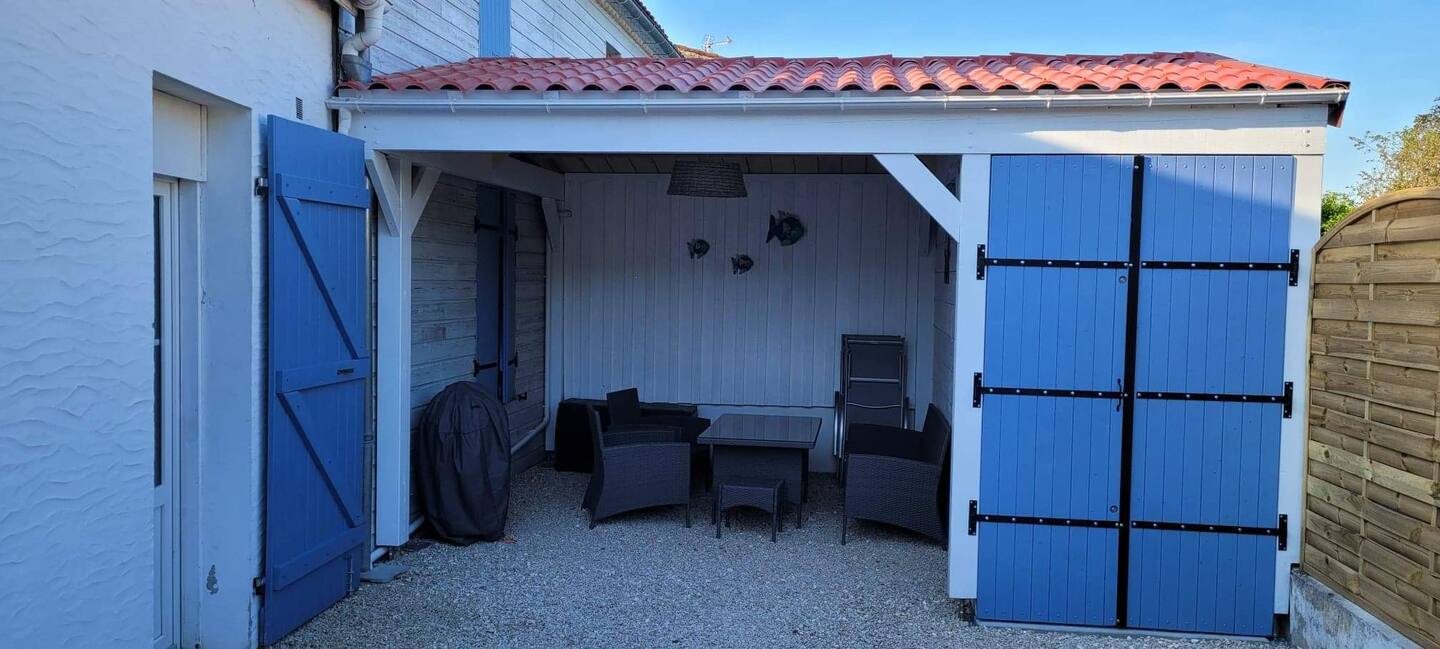 salon de jardin, ainsi qu’un coin repas abrité, barbecue électrique et transats(2)